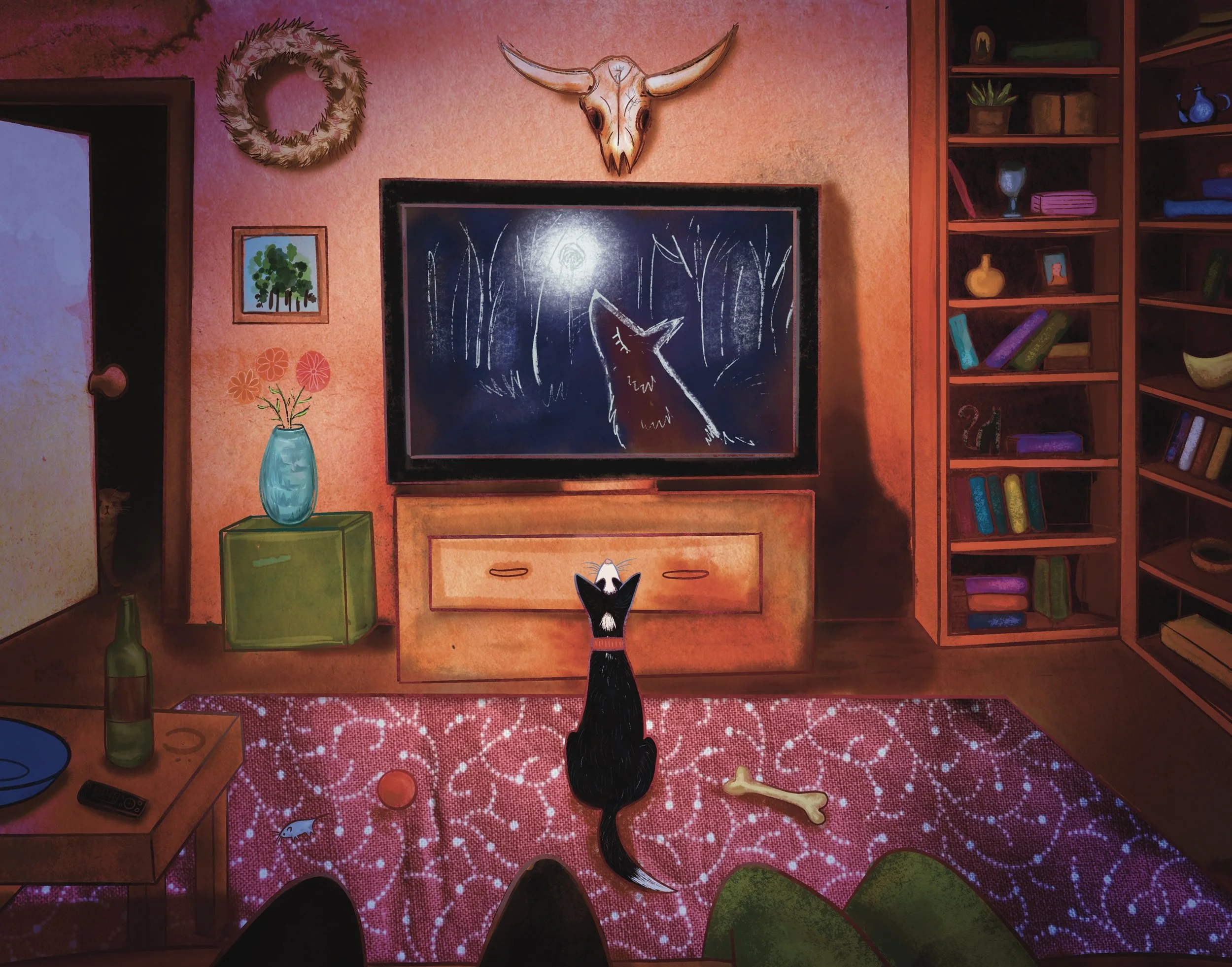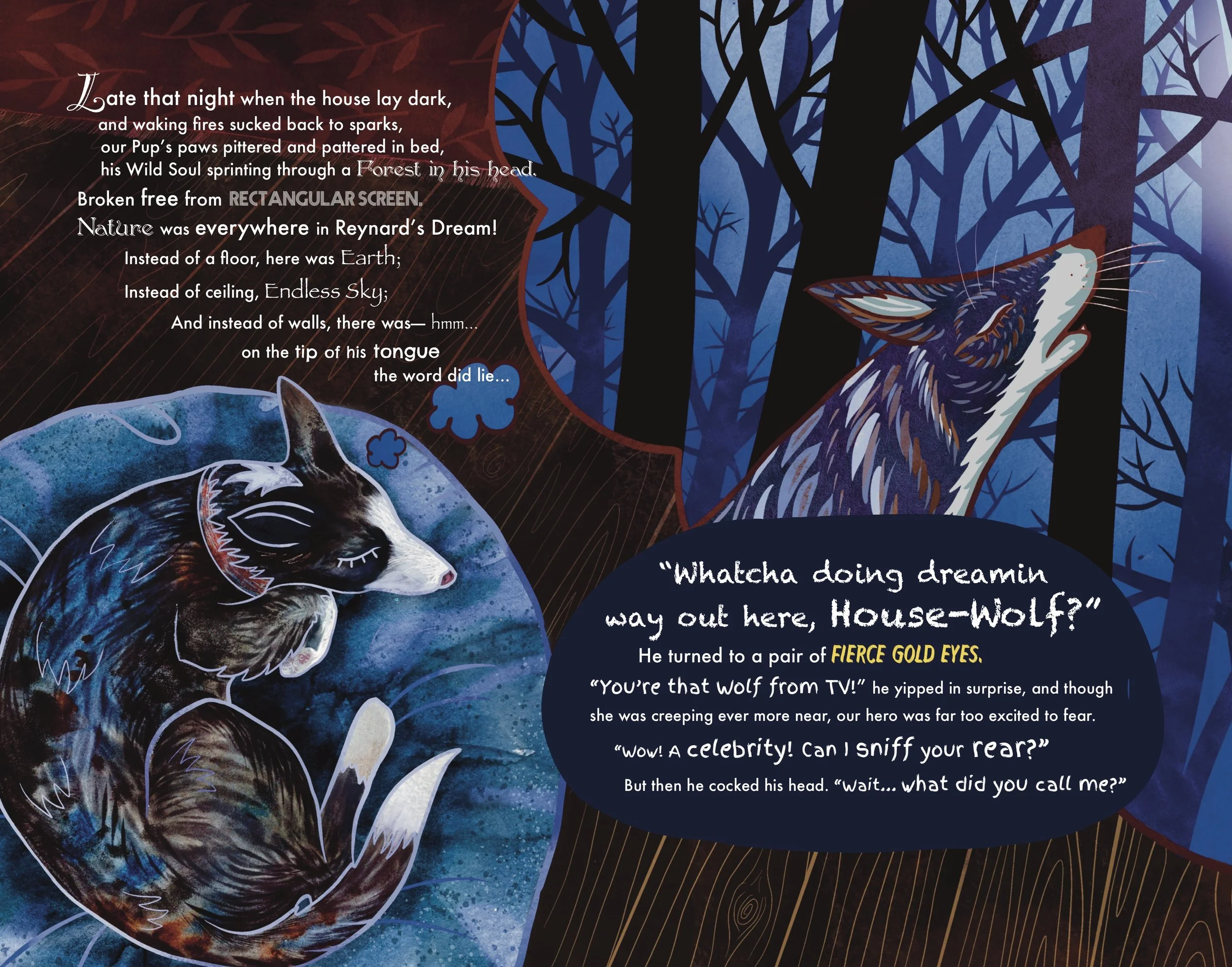 Reynard the House-Wolf is a celebration of Wildness Within and Without. It tells the story of Reynard, an unsuspecting suburban dog who watches TV one night and dares to howl along with the wild wolf on the screen. Summoned by his howling, the wolf visits in a dream and beckons Reynard to forsake his cozy bed and ever-replenishing dog food bowl to seek out the real Nature Channel. The next morning as his human servant is bringing in the groceries, the front door swings wide and the question howls in his Dog-Soul: will he or won't he?